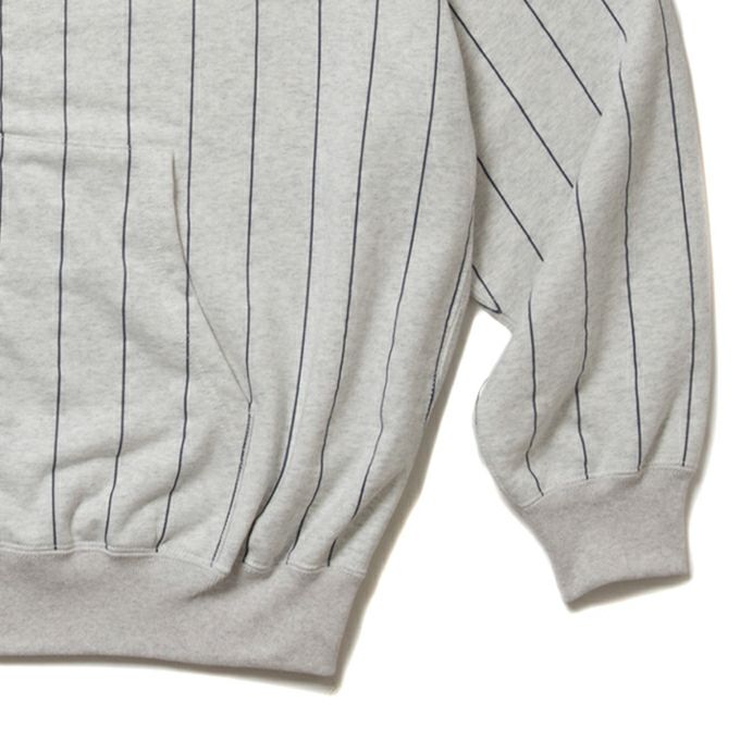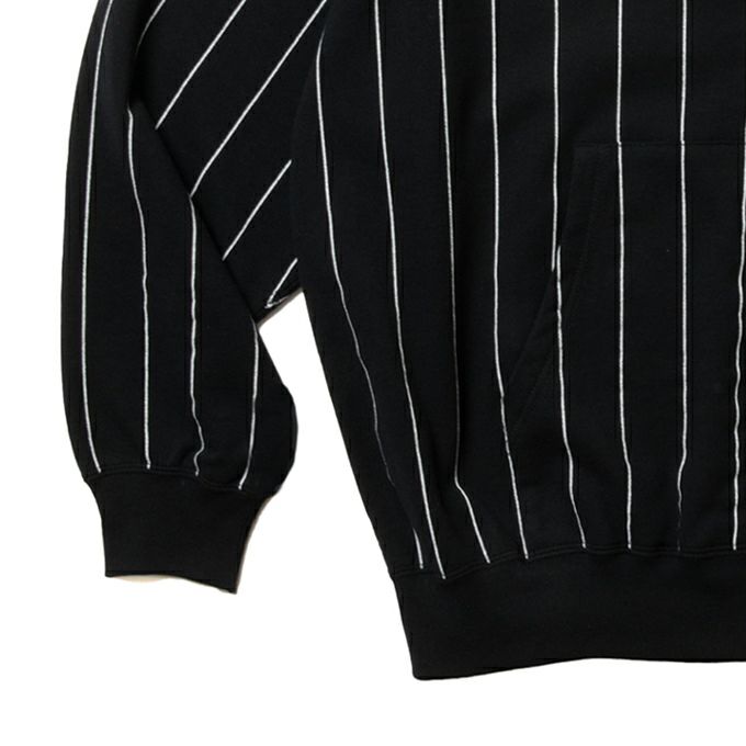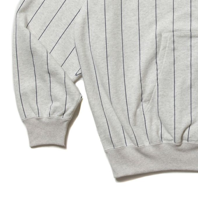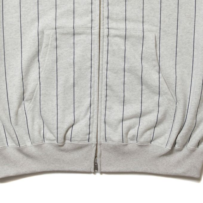 オリジナルで編み上げた空紡糸を使用した裏毛に対して、全面プリントでストライプ柄を施したオリジナルファブリックを使用し製作されたALLOVER PRINT OPEN END YARN HEAVY OZ SWEAT ZIP HOODIEです。