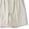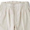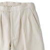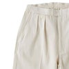 前見頃はプリーツとクリースラインが配してあるのでカジュアルになりすぎず、ベルトループがないためタックインの際も
