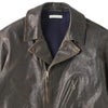 フロントジップを上まで閉め上げた際に綺麗に返りを見せるアールのついた品の良いヨーロッパ調の襟の形は、所謂なライダースジャケットとは違い、飛行服の名残を感じ取れるノスタルジーなデザインとなり、とてもモダンな表情になっています。