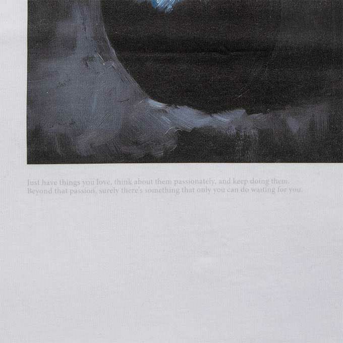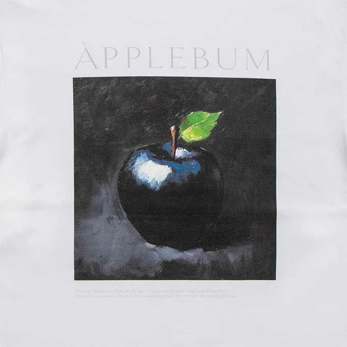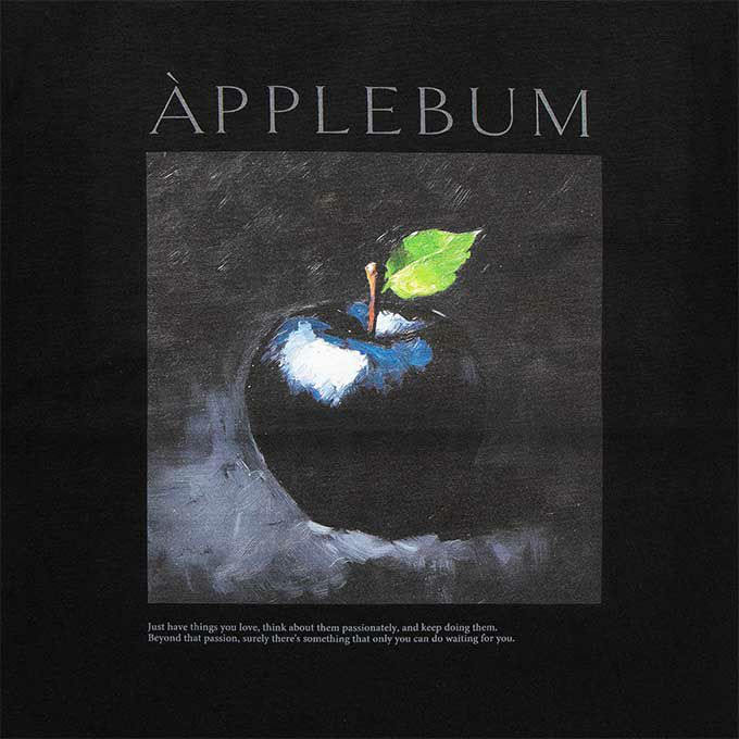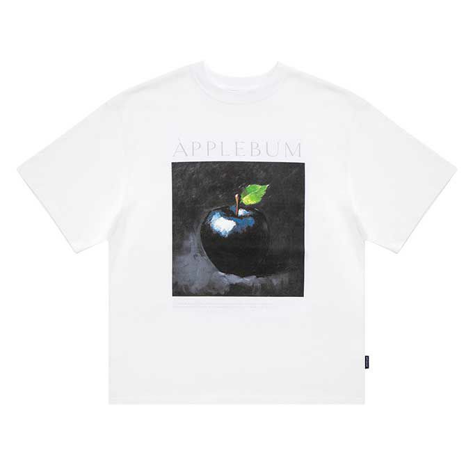黒い林檎を描いた油絵を大胆にプリントしたグラフィックTシャツ。