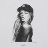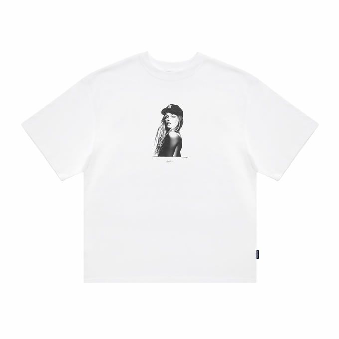 架空の90年代スーパーモデルのモノクロ写真を大胆にプリントしたTシャツ。