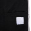 右腿後部にセルフォンポケットと織りネームを縫い付け。"