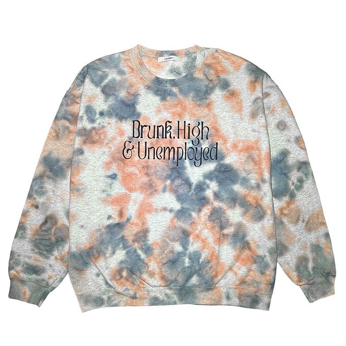 日本のTIE DYEアーティストのパイオニアであるDEAD DYEにタイダイ染をしてもらい、Trailer Park Boysのライブツアー映画のタイトルから着想された、"酔っ払ってハイでプータロー"の意味がプリントされたデザイン。
