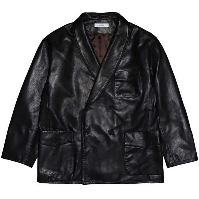 オイルを多くなめして仕上げたカウハイドレザーでしっとりとなめらかで上質なツヤがあるレザーダブルスモーキングジャケット。