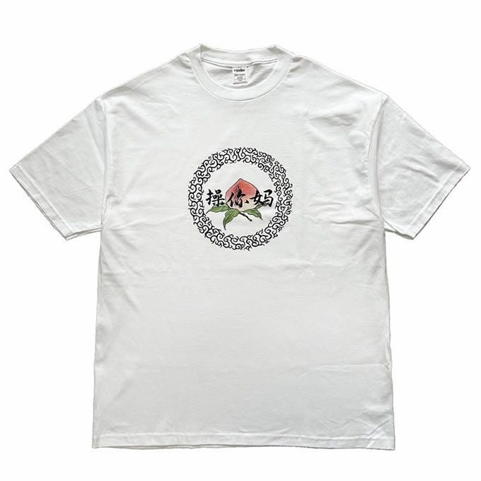 桃に見立てたpussyに中国語で(ツァオ・ニー・マー)プリントされたグラフィックT。