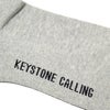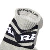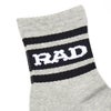 ショート丈チューブソックス。ジャガードで履き口に「RAD」、履き口裏に「WWW.RADIALL.NET」、足底に「KEYSTONE CALLING」が入る。