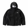 従来のマウンテンパーカをベースに両ブランドのロゴと曲線を随所に落とし込んだデザイン。